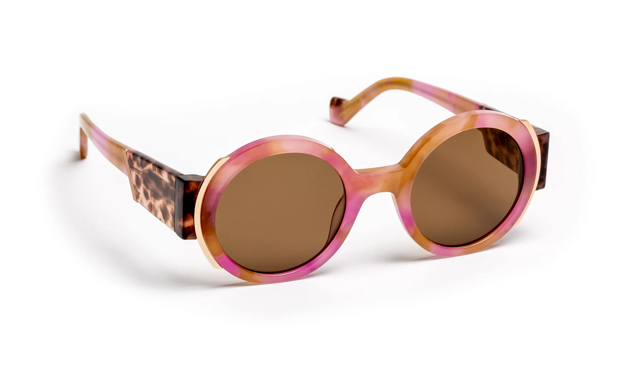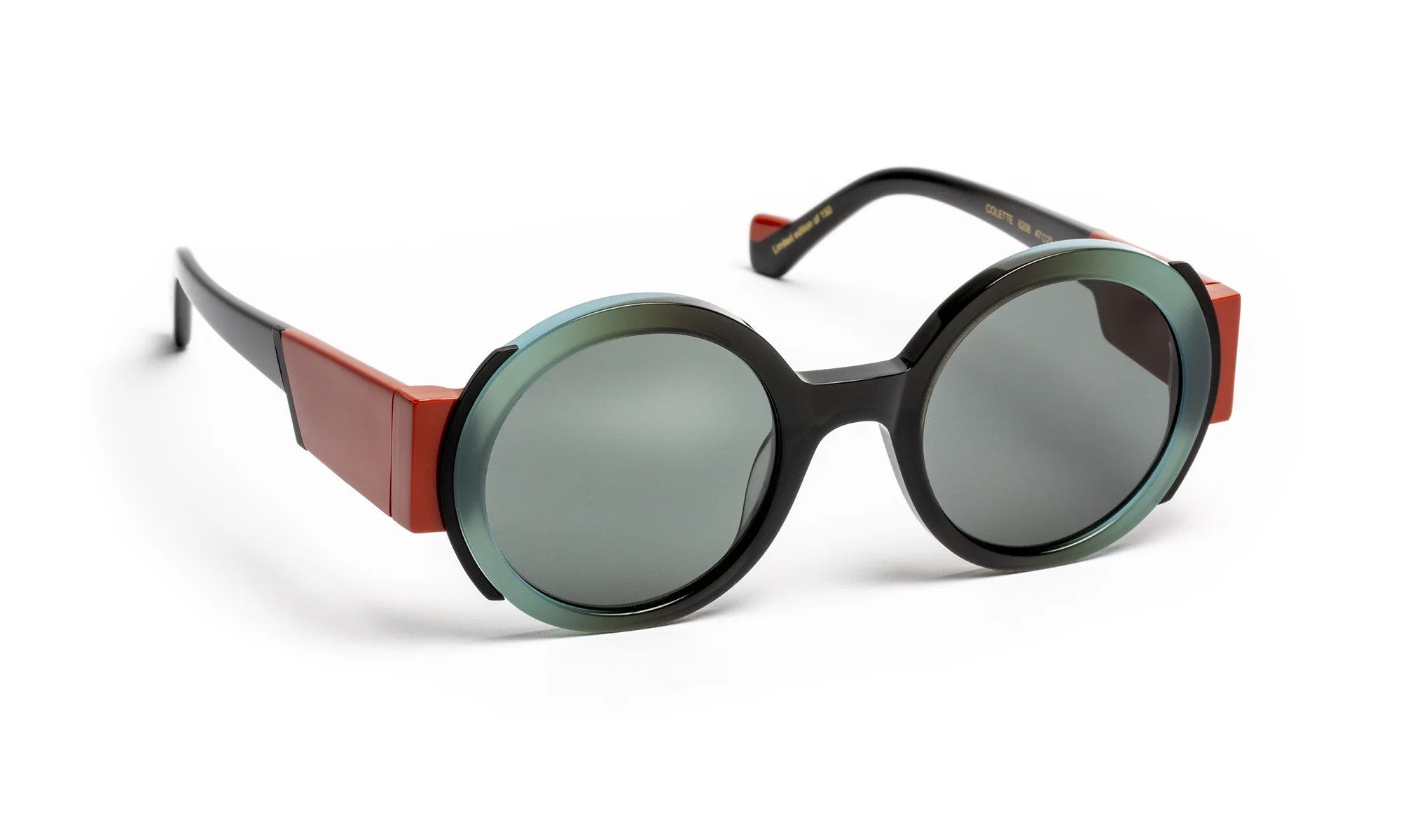 Sophisticated acetate sunglasses, sublimated by an entirely hand-crafted faceted finish. Its wide, delicately hollowed temples catch the light and reveal subtle reflections for a contemporary, assertive look. The translucent gradient color palette plays on transparency and depth, creating changing light effects that illuminate the face.