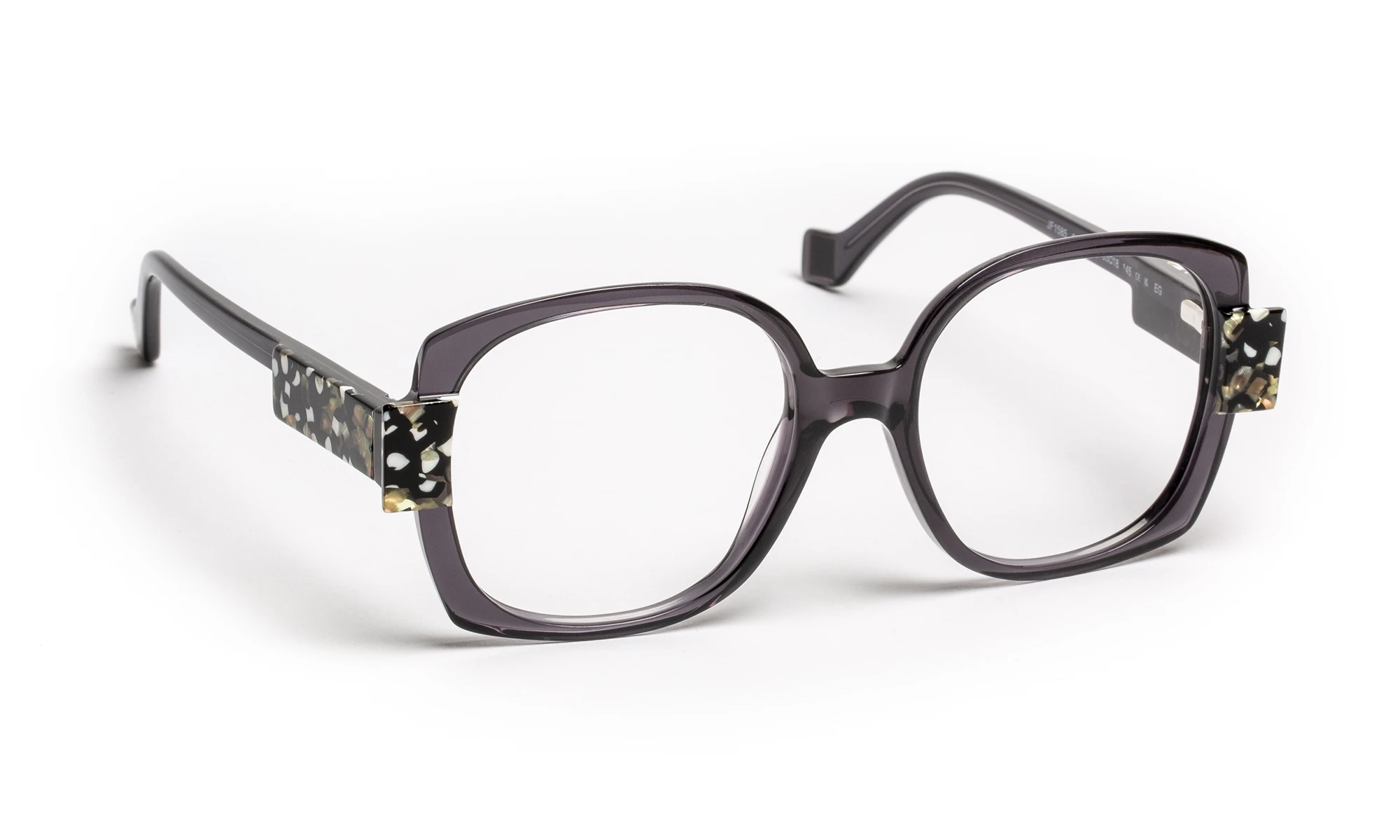 Acetate face and temples, large shape with rounded curves and marked angles. The temples are adorned with multicolored details, adding a unique, artistic touch. The high-gloss finish accentuates the brilliance of the color and highlights the modern, refined lines of the ensemble.