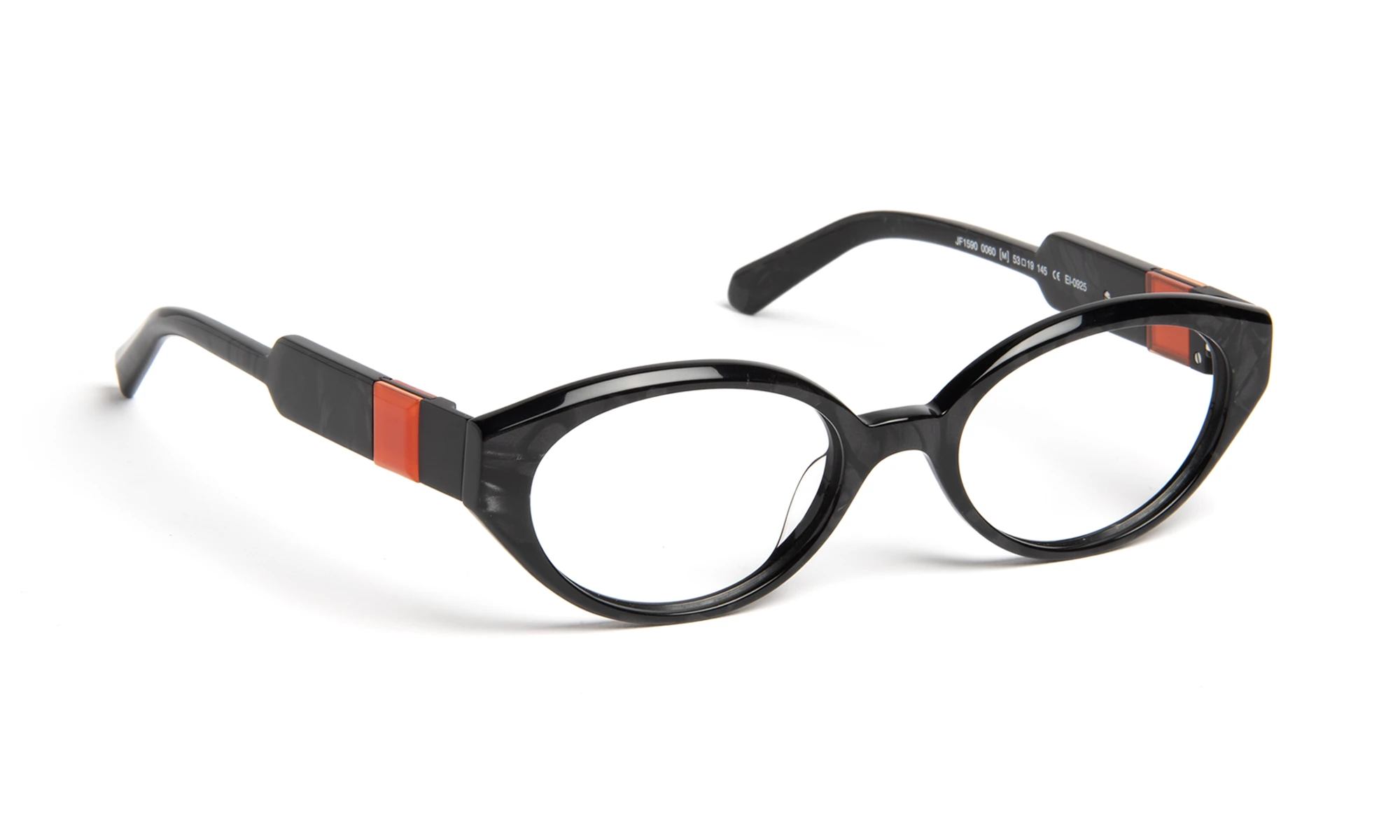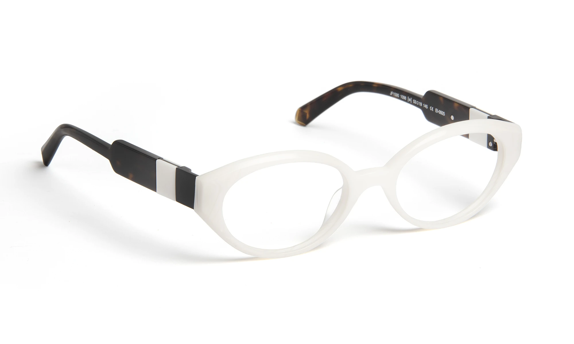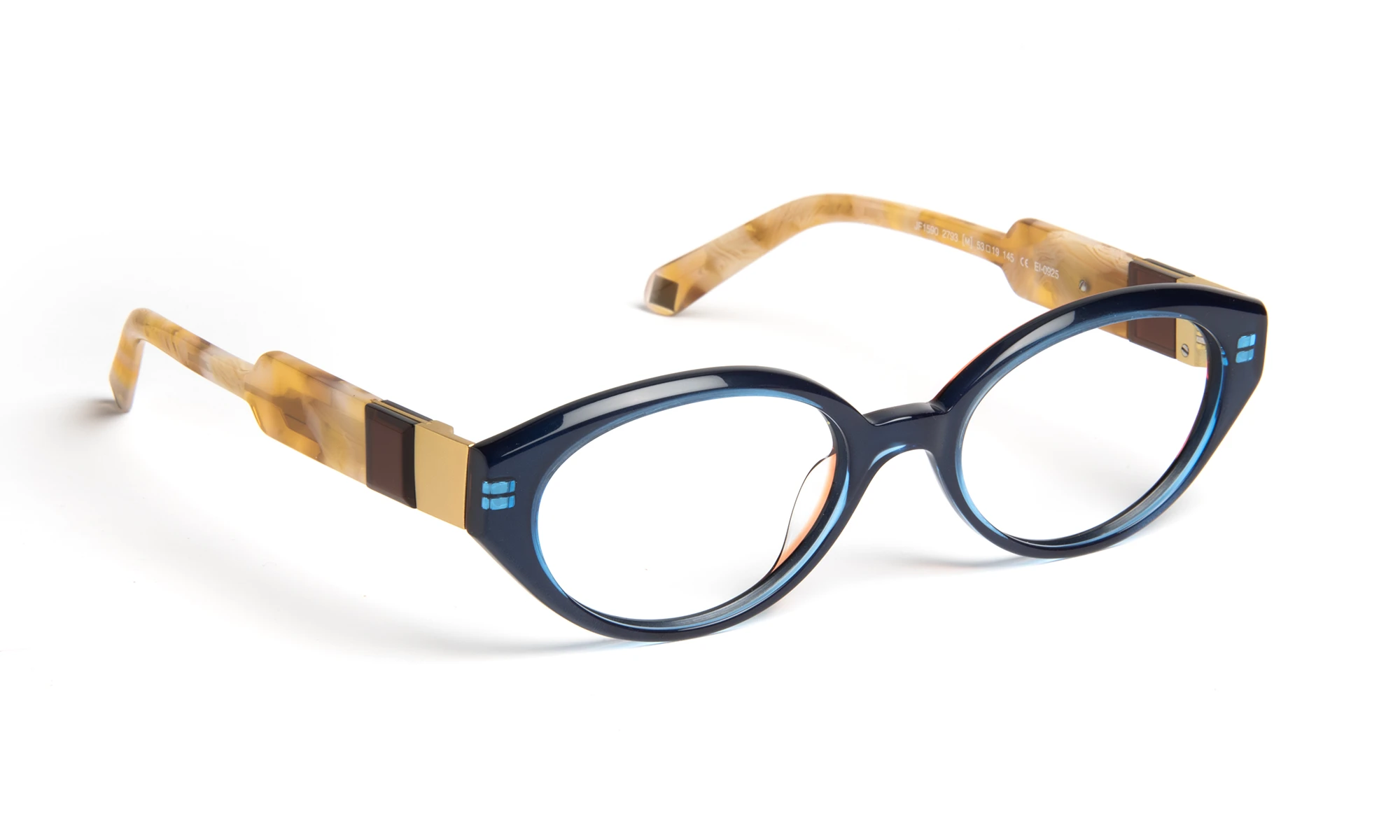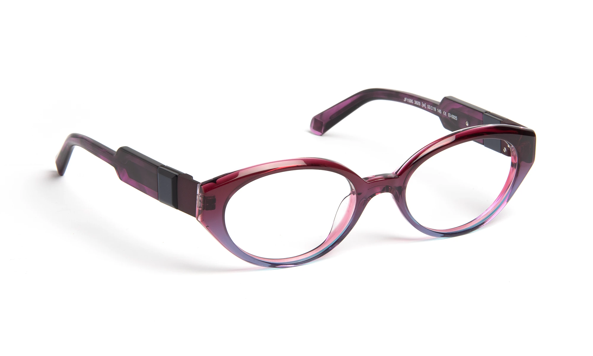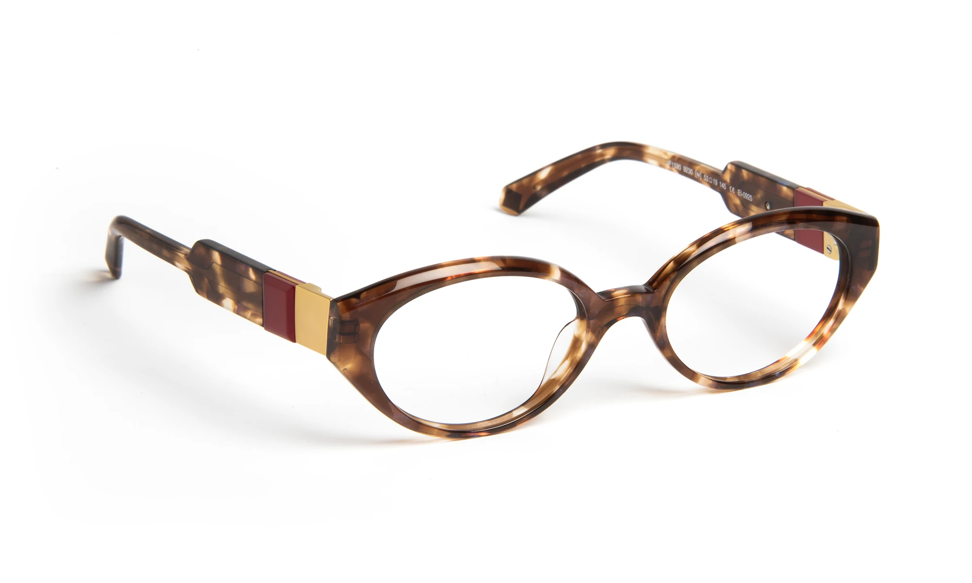Frame in acetate for both front and temples, sculpted in an assertive geometry that combines soft curves and structured angles. The temples feature a duo of decorative squares in metal and beveled acetate, adding a refined graphic accent. The glossy finish intensifies the colors and highlights the modern, elegant lines of the whole.