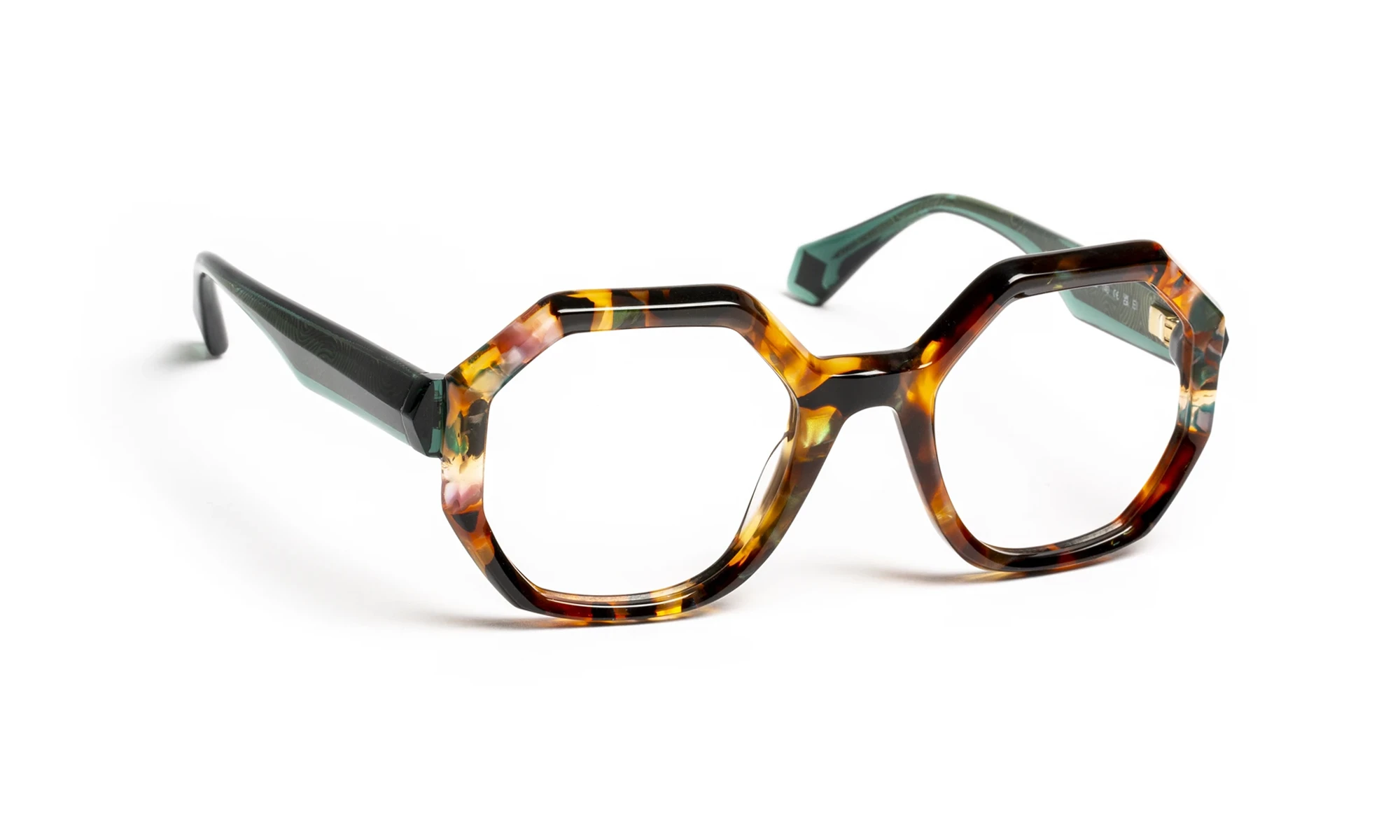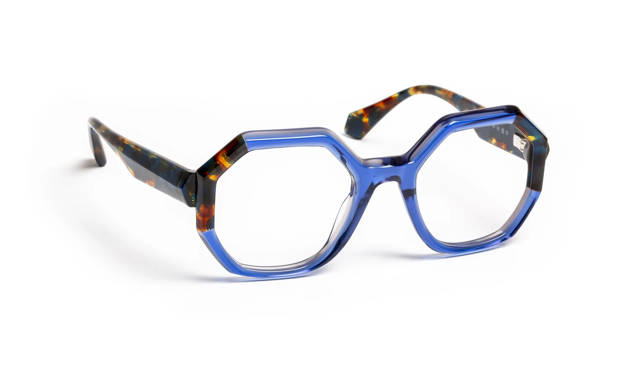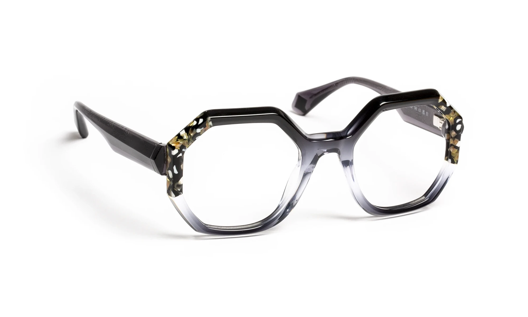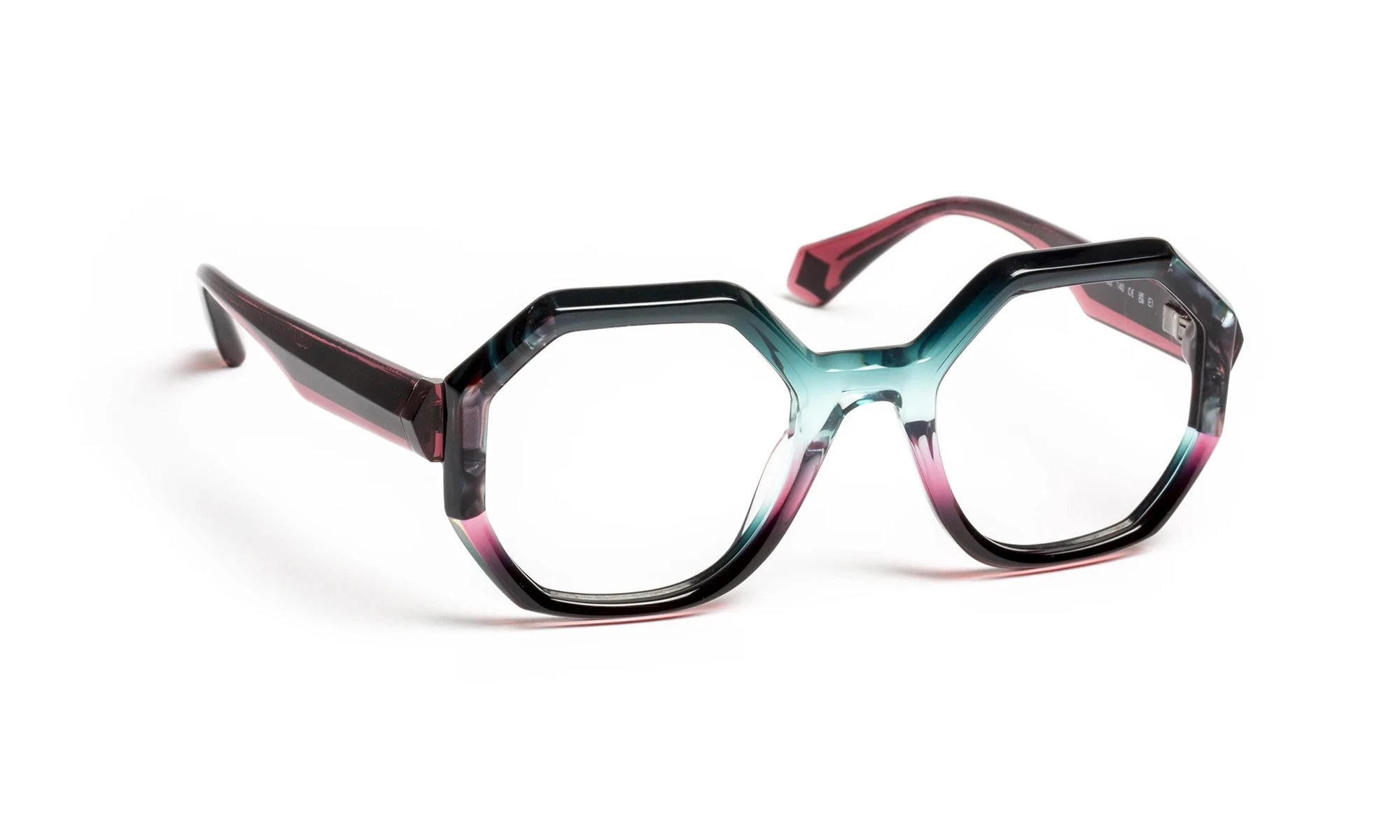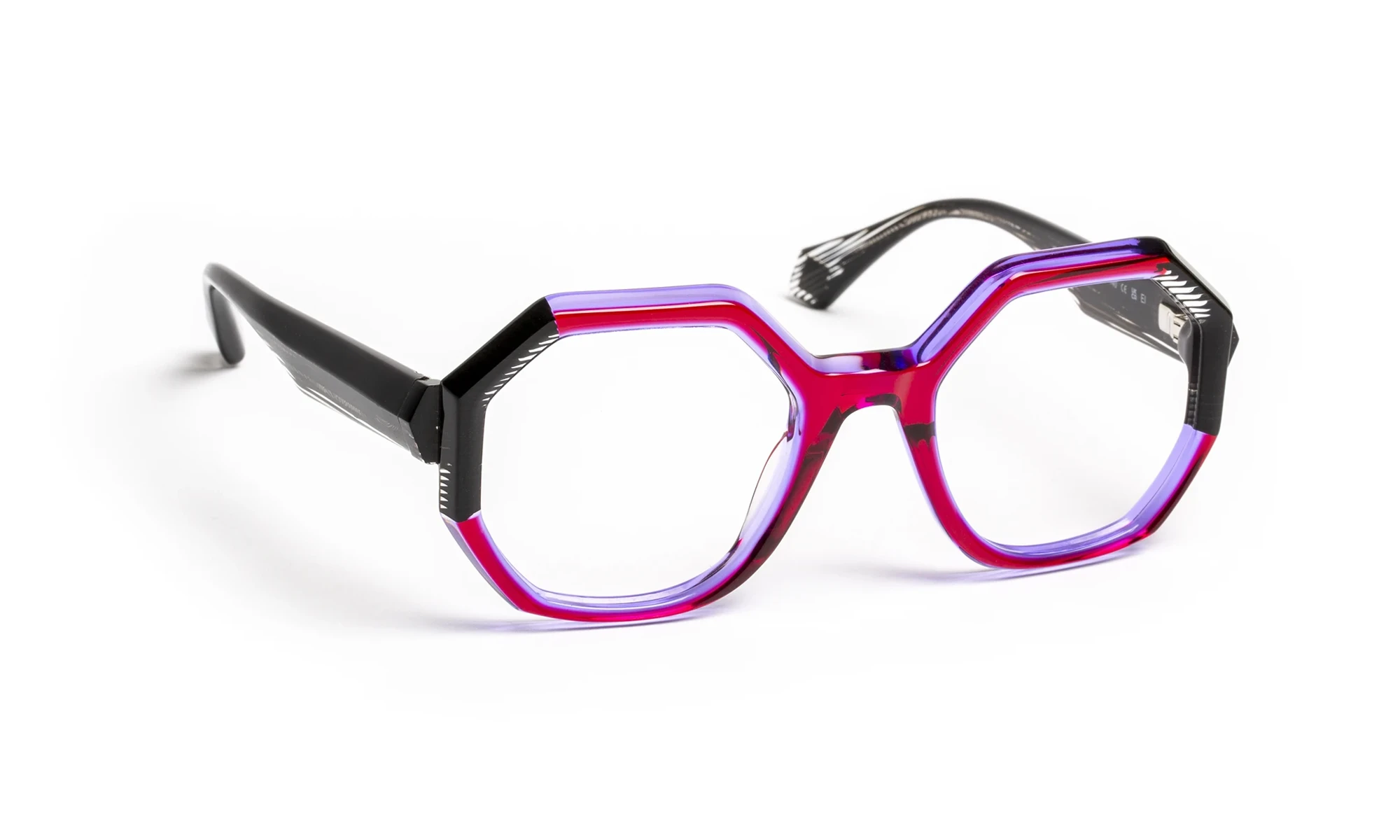 Design and color play with light thanks to transparent materials. Faceted volumes, precise bevels and translucent sparkles create a fashionable look with changing reflections. The triangular flex temple features a metal bristle with an engraved pattern that only appears in the light. Graduated translucent materials, mixed with colorful touches, offer a vibrant, elegant aesthetic.