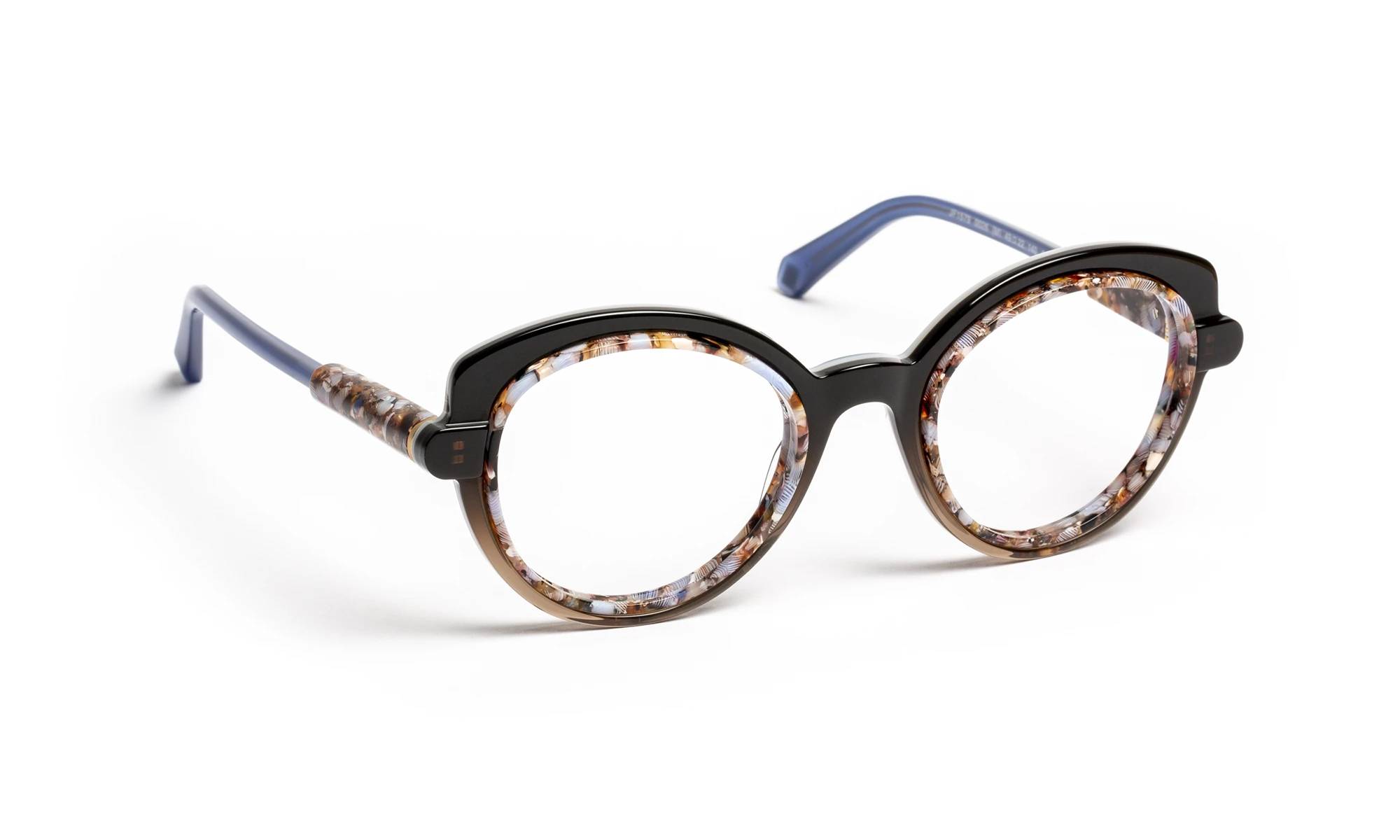 Ce modèle met en valeur la profondeur de l’acétate à travers un jeu de volumes sculptés et de transparences raffinées. Les effets de dégradé, résolument tendance, apportent des variations de couleur subtiles qui réagissent à la lumière. La face aux tenons allongés accentue cette richesse visuelle, tandis que les branches, travaillées avec un effet totem et un manchon diamanté, soulignent l’originalité affirmée de la forme.